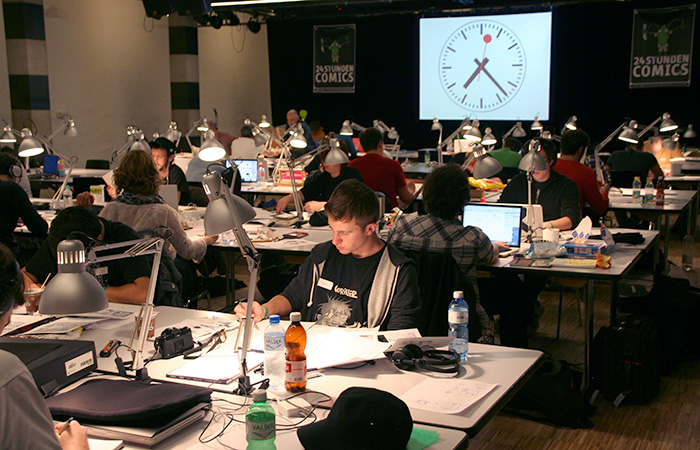 DruckenWeltweit an rund 40 Austragungsorten haben sich am 20. Oktober 2012 Hunderte von begeisterten Comiczeichnerinnen und -zeichnern der Herausforderung gestellt, in 24 Stunden einen 24-seitigen Comic zu zeichnen. Der Start in der Alten Kaserne erfolgte um 12 Uhr mittags Lokalzeit mit 58 Zeichnerinnen und Zeichnern am Start. 29 Teilnehmerinnen und Teilnehmer haben erfolgreich abgeschlossen – und alle anderen haben auch fantastische Arbeit geleistet. Wir waren einmal mehr begeistert und tief beeindruckt!