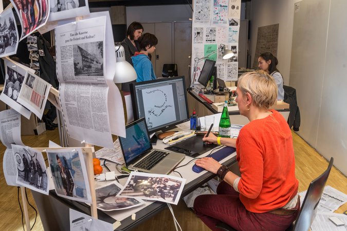 Mitglieder des Vereins Comic Panel Winterthur zeichnen tatsächliche und wahrscheinliche Geschichten rund um die Alte Kaserne. Den Text für das ungewöhnliche Geschichtsheft, das an diesem Nachmittag entsteht, hat die Journalistin Elisabeth Moser eigens für das Projekt verfasst. Die Zeichnerinnen und Zeichner knüpfen an den historischen Fakten an und spinnen daraus ihre individuellen Geschichten. Man kann ihnen beim Entstehen der Comics über die Schultern schauen und dabei eine Menge über Zeichentechniken und über die Alte Kaserne erfahren.