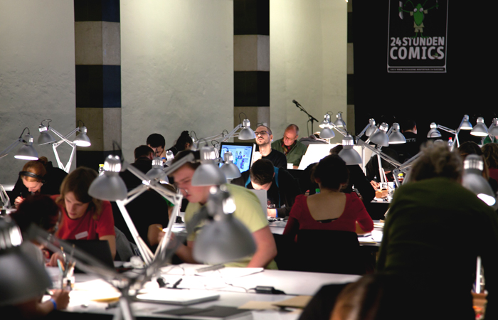 DruckenIm Kulturzentrum Alte Kaserne in Winterthur findet seit 2008 jedes Jahr ein 24 Stunden Comics statt. Innerhalb von 24 Stunden schreibt und zeichnet jeder der 60 Teilnehmerinnen und Teilnehmer einen 24-seitigen Comic von A bis Z. Es wird ohne Vorarbeit gestartet, die Storys werden vor Ort geschrieben und gezeichnet, koloriert und ausgeschmückt. Es darf gemalt, geklebt und am Computer gezeichnet werden – die Technik ist frei, ebenso das Format der Comics. Ein-Bild-Geschichten sind nach den offiziellen Richtlinien nicht erlaubt, man muss 24 aufeinander folgende Seiten produzieren, wenn man der Idee des Erfinders, dem Amerikaner Scott McCloud, folgen will. Nach 24 Stunden müssen die Comics fertig sein.