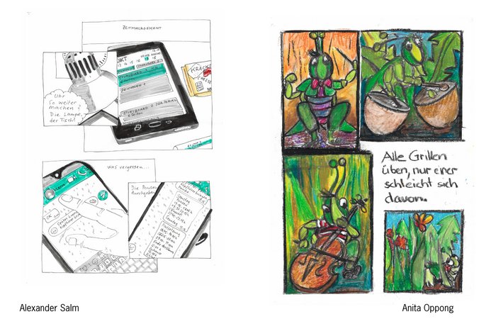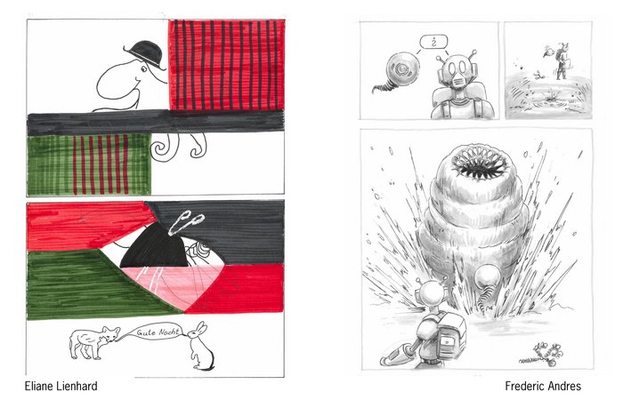 DruckenEin 24 Stunden Comics im Coronajahr - wer sich dereinst an die Situation in diesem Jahr der weltweiten Pandemie erinnert kann es wohl kaum glauben, dass wir diesen Anlass mit 60 Zeichnerinnen und Zeichnern aus der ganzen Schweiz durchführen konnten. Just im September und Oktober schien sich die Situation zu beruhigen, man hatte die Schutzmassnahmen akzeptiert und das Maskentragen - Händewaschen - Abstandhalten verinnerlicht. Dank der grosszügigen Platzverhältnisse im Saal konnten wir die von Bund und Kanton verordneten Schutzmassnahmen umsetzen. Schön war es, das Vertrauen der Zeichnerinnen und Zeichner zu erhalten, denn sie sind so zahlreich wie eh und je erschienen. In diesem eher kulturverhinderten, sozialverarmten, bemühten Corona-Jahr waren alle glücklich, dabei zu sein. Auch die offene Comic-Werkstatt für Kindet hat am Samstagnachmittag unter der Leitung von Gabriela Maier und Nadine Bösch vom Comic Panel Winterthur stattgefunden. Eifrig wurden Figuren kreiert und Ideen umgesetzt mit der Vision, in der Zukunft bei den «Grossen» im Saal mitmachen zu können.